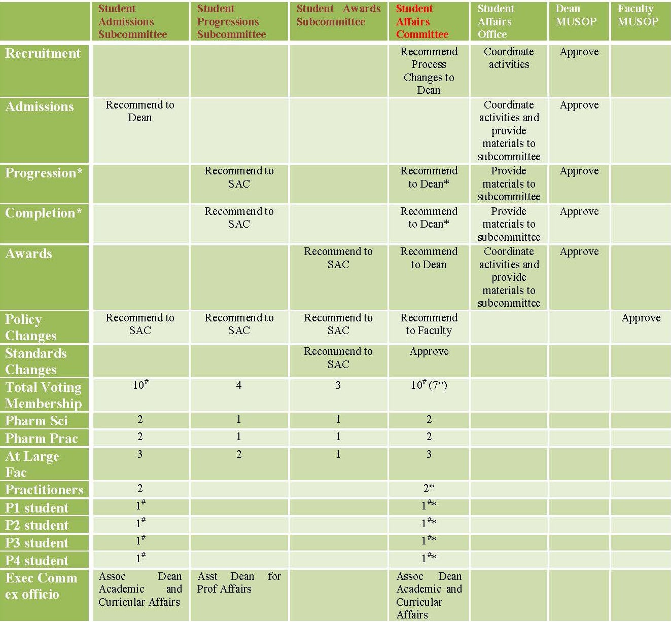 The structure, composition, duties and responsibilities of the Student Affairs committee and its subcommittees is dictated by the Marshall University School of Pharmacy (MUSOP) bylaws. Refer to the relevant sections of the current version of the MUSOP bylaws for official policy.